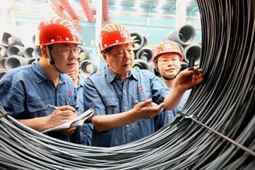 图为吴栋材(中)在线材厂查看产品质量。