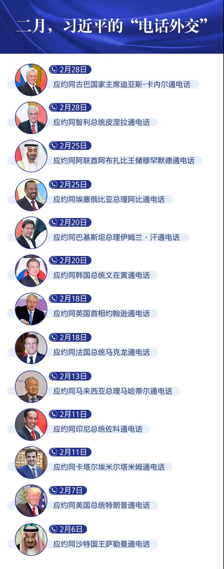 特殊时期,非常外交。2月,习近平会见了来华访问的柬埔寨首相洪森;同蒙古国总统巴特图勒嘎会谈;与十多位外国领导人通电话,开展“电话外交”;给比尔·盖茨回信,感谢盖茨基金会支持中国抗击新冠肺炎疫情等。