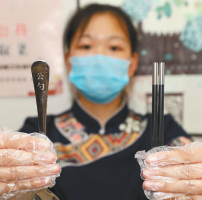 近日,河北廊坊市安次区一家饭店的工作人员在展示公勺公筷。
