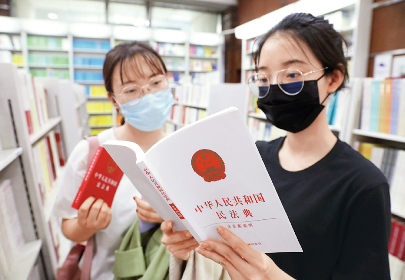 《中华人民共和国民法典》单行本及多个版本在新华书店上架以来,吸引不少读者驻足选购。图为2020年6月9日,读者在北京王府井新华书店翻阅《中华人民共和国民法典》。 中新社发 陈晓根/摄