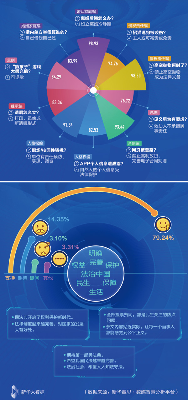 新华睿思数据显示,民法典草案在网上征求意见过程中,“离婚冷静期”、“高空抛物”、“高利放贷”等问题关注度高。网民对民法典草案普遍表示支持和肯定,认为“民法典开启了权利保护新时代”、“法治中国给老百姓带来实实在在的好处”。(数据统计时间:2020年5月23日9:00—5月24日12:00) 新华网《睿思一刻》供图