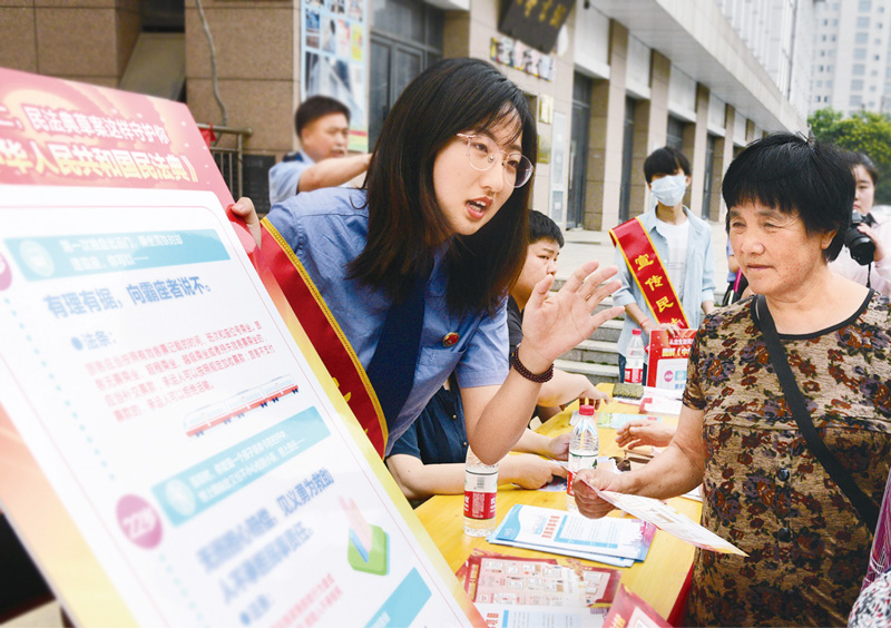 2020年6月3日,江苏省镇江市润州区七里甸街道联合公安、检察院、法院、司法等部门开展“民法典守护你”送法进社区活动。图为检察院工作人员在为社区居民解读民法典的相关内容。 人民图片 石玉成/摄