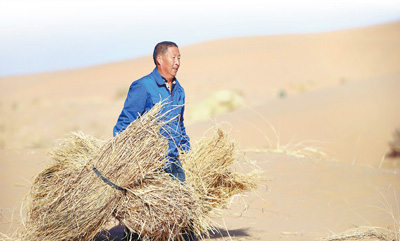 图为甘肃古浪县北部沙区旱麻岗治沙点,一位治沙人在搬运稻草(摄于今年3月)。