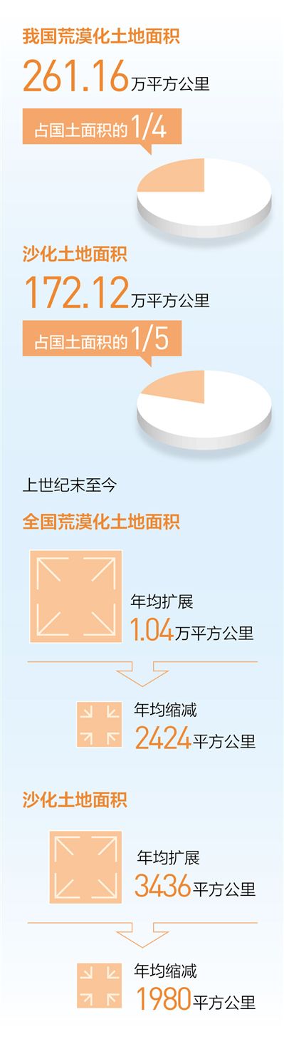 防沙治沙成绩卓越,但仍面临不少困难。总体上看,我国仍缺林少绿、生态脆弱,荒漠化土地达261.16万平方公里,占国土面积1/4;沙化土地172.12万平方公里,占国土面积近1/5。