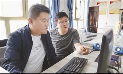马兴全(左)和马兴军兄弟俩在电商办公室里查看网上订单。