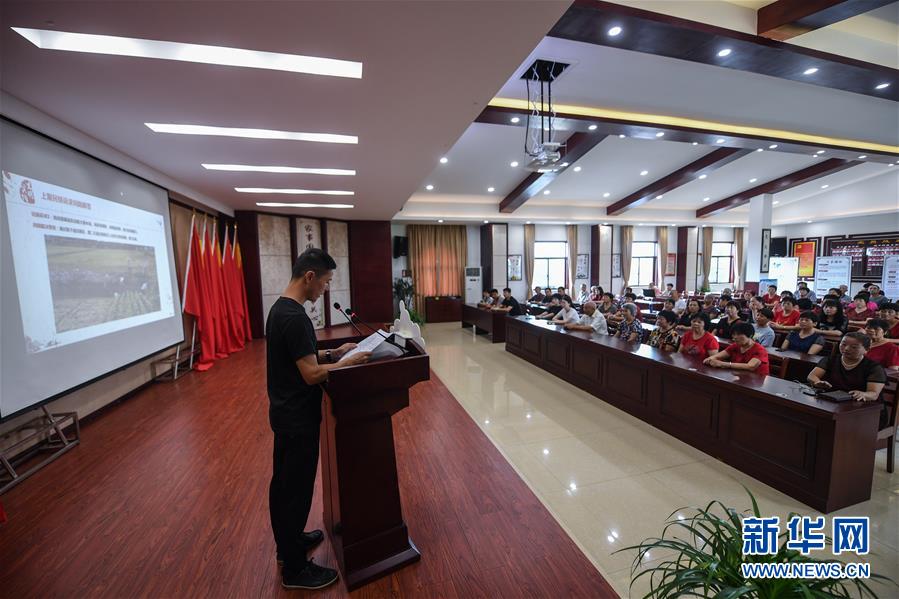 7月2日,浙江海宁市许村镇李家村村委会主任沈伟强在文化礼堂给村民进行每月的“李家播报”,向台下乡亲播报近一个月来国内外以及当地镇村的新闻快讯。 新华社记者 徐昱 摄