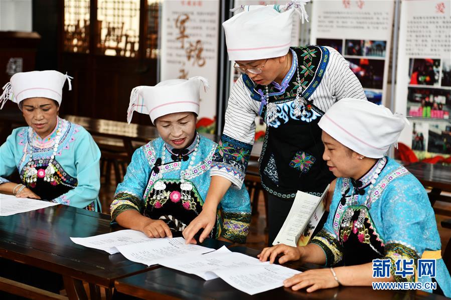 在贵州省龙里县新时代文明实践中心,龙里县“金嗓子”志愿服务队队长罗丽萍(左一)在指导志愿者们演唱新时代文明山歌(7月3日摄)。 新华社记者 杨文斌 摄