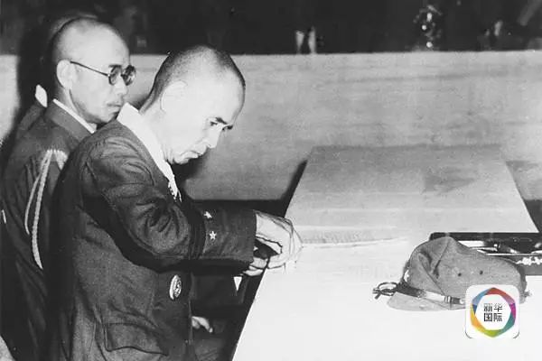 这是侵华日军总司令冈村宁次等在南京签盖降书。