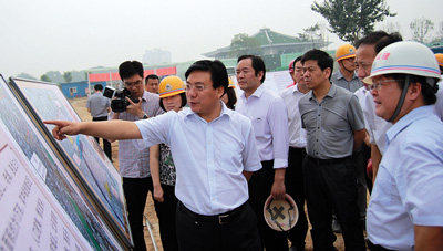 洛阳市市长李柳身(中)调研隋唐洛阳城“一区一轴”区域开发项目。