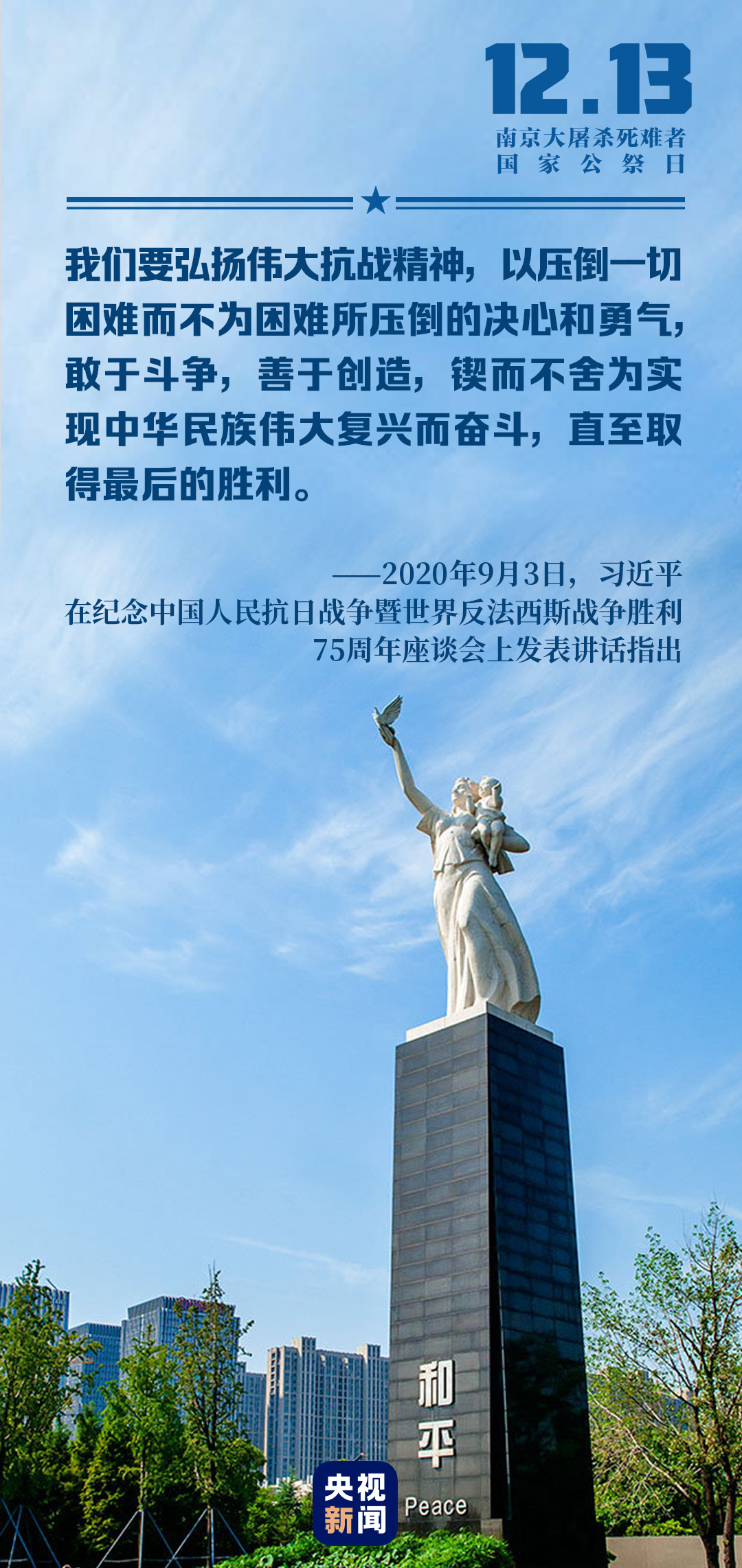 这既是一个饱经沧桑的国家对死难同胞的隆重祭奠,是一个走向复兴的民族面对昔日伤痛的深刻思考,也是向世人宣示,中国人民反对侵略战争、反对篡改历史的立场坚定不移,中国人民团结一心实现民族复兴的决心坚定不移,中国人民捍卫人类尊严、维护世界和平的意志坚定不移。