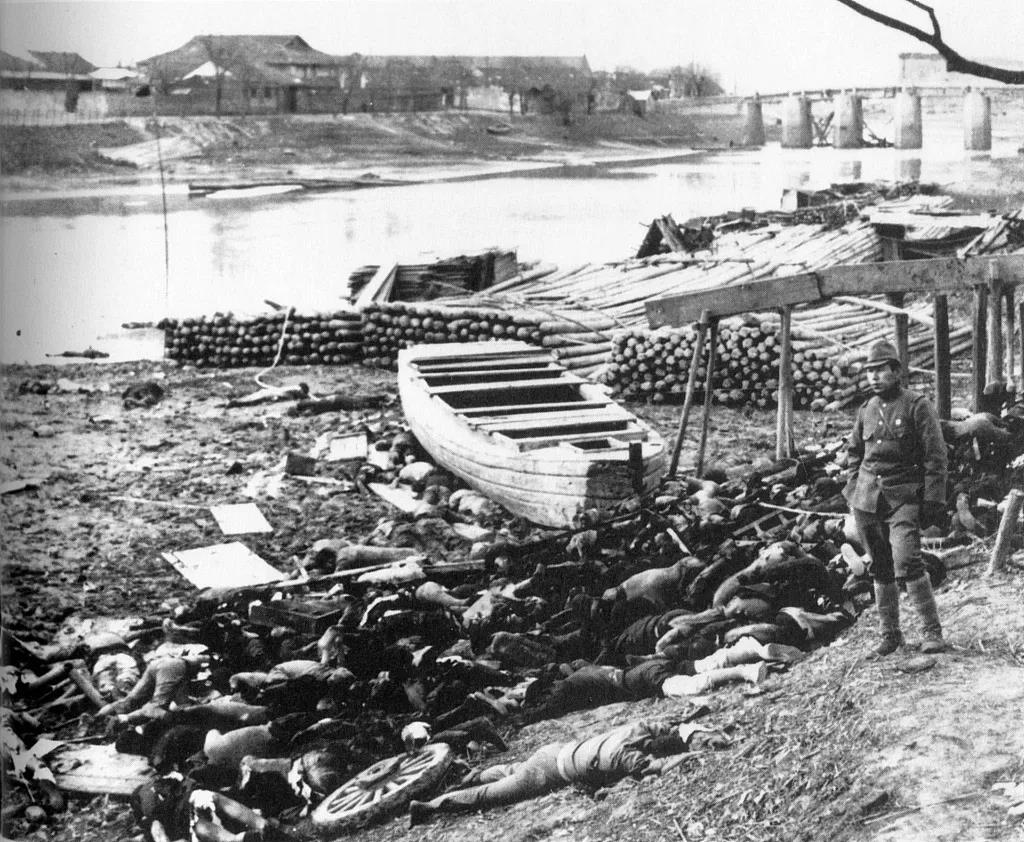 1937年底,进入南京的日军将中国军民送到下关江边以机枪扫射,尸体堆满了江边,惨不忍睹,行凶后的日军站在尸体旁,若无其事。这张照片是由日军目黑辎重兵联队兵站第十七中队村濑守保所拍摄。