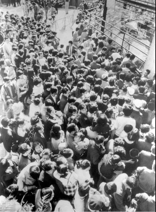 1972年11月5日,日本东京,民众排队观赏大熊猫。在《樱桃小丸子》中,小丸子的奶奶回忆说,熊猫第一次到日本时,老中青三代共同疯魔:“排队3小时,观看10秒钟。”