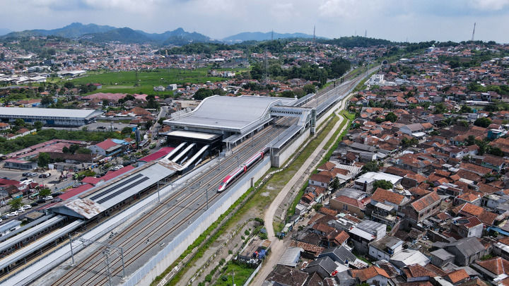 这是2025年5月20日在印度尼西亚帕达拉朗拍摄的雅万高铁列车(无人机照片)。