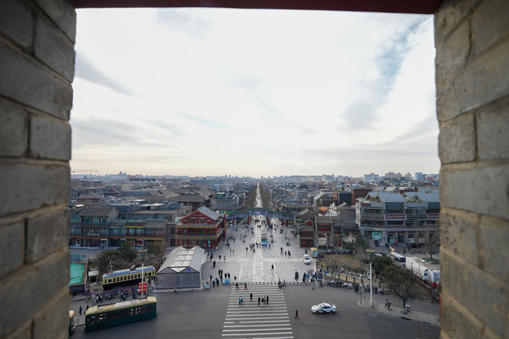 2024年12月26日,从正阳门箭楼内向南拍摄的北京前门大街和远处的永定门城楼。