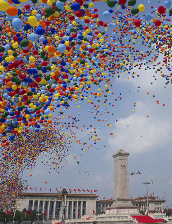 2025年9月3日,纪念中国人民抗日战争暨世界反法西斯战争胜利80周年大会在北京隆重举行。这是纪念大会现场放飞气球和鸽子。