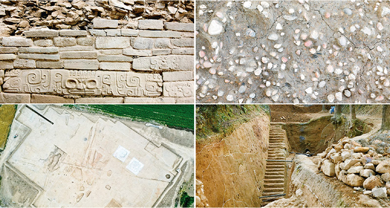 2020年中华文明探源工程第五阶段实施以来,在深化对中华文明起源与早期发展阶段整体认识的同时,聚焦关键时间节点和重大事件,精心设计多学科综合研究,取得了一系列进展。左上图为陕西神木石峁遗址皇城台出土的石雕。右上图为四川广汉三星堆遗址发掘区出土的玛瑙籽料。左下图为山西襄汾陶寺遗址宫城内的大型夯土建筑基址。右下图为浙江余杭良渚遗址水利工程遗迹。