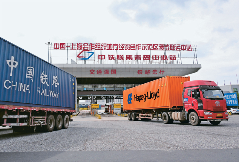 加快发展多式联运,是推动交通物流降本提质增效的关键举措,也是构建现代化综合交通运输体系的必然要求。图为2025年8月27日,货运卡车从位于山东青岛的中国—上海合作组织地方经贸合作示范区多式联运中心驶出。