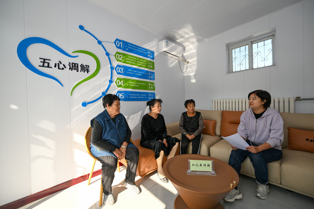 在天津市宁河区芦台街道金华路社区,社区党总支副书记吴蕊(右一)就社区监控设备安装问题为社区居民进行解答(2024年10月11日摄)。金华路社区积极践行新时代“枫桥经验”,将原社区居委会闲置用地提升改造成为联络群众的基层综合治理阵地——“解铃小院”。