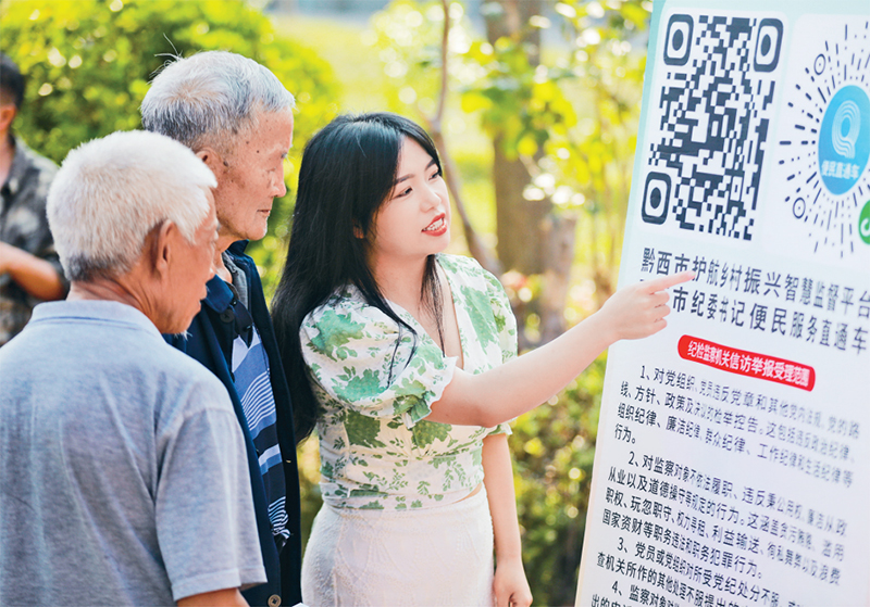 近年来,各地探索运用数字技术创新监督手段,提升监督的针对性和效果。图为2024年9月14日,贵州省黔西市纪检监察干部在锦绣街道锦绣社区指导群众利用微信小程序等进行举报监督。