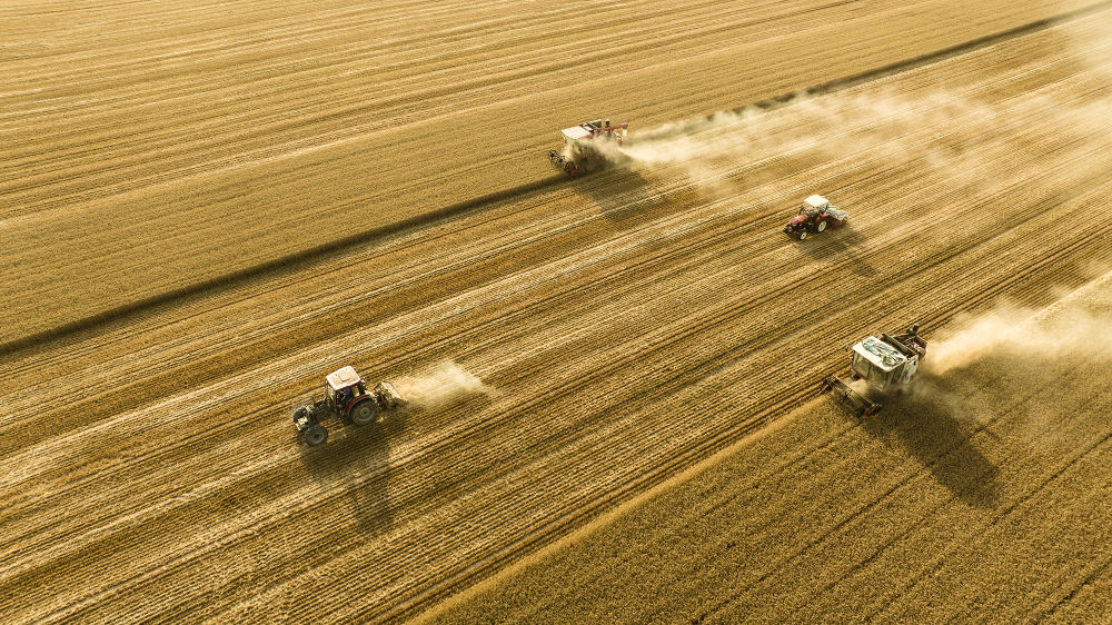 2025年6月4日,在河南省商丘市梁园区李庄镇潘堂村志诚种植农民专业合作社,农机手操作机械在农田作业(无人机照片)。