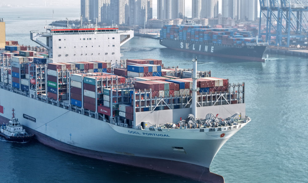 2025年12月4日,货轮进出山东港口青岛港前湾港区(无人机照片)。