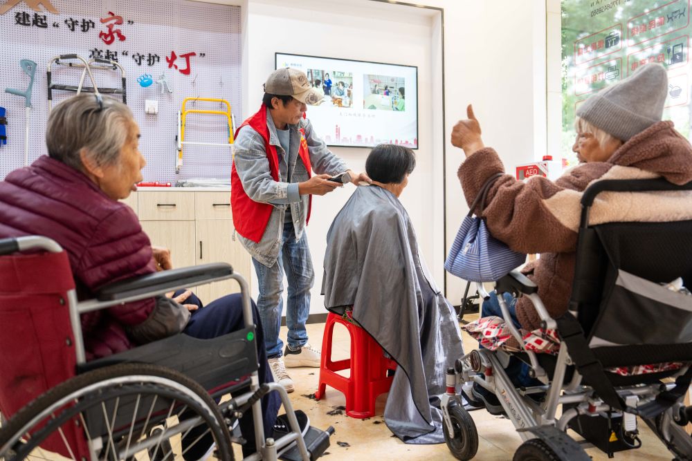 2025年11月6日,在湖南省长沙市望城区高塘岭街道湘陵社区,志愿者为老年人和残疾人士免费理发。