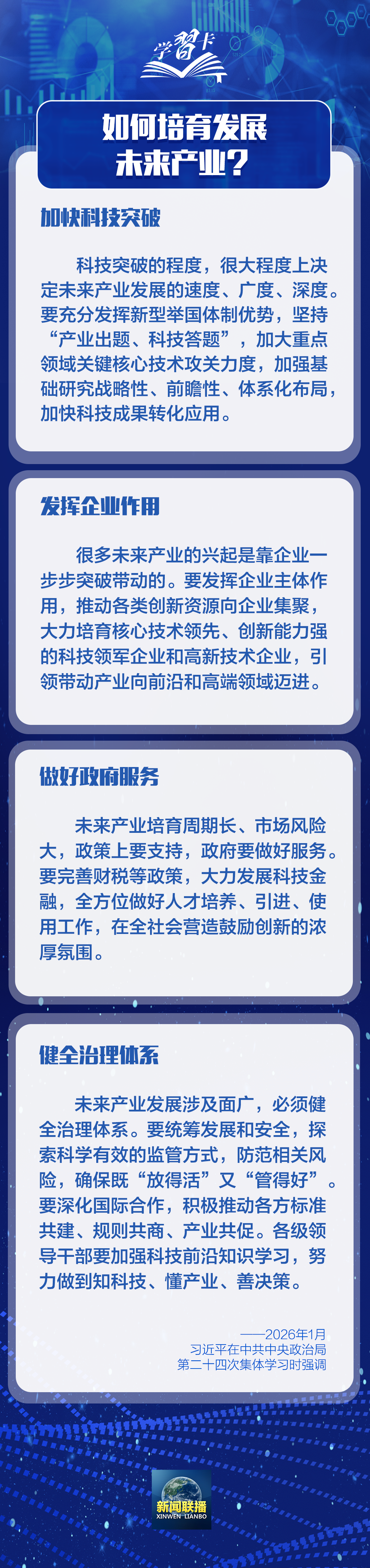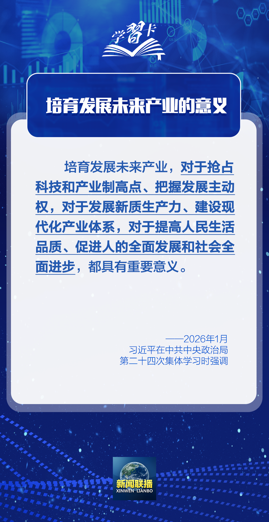 中共中央政治局1月30日下午就前瞻布局和发展未来产业进行第二十四次集体学习。中共中央总书记习近平在主持学习时强调,新一轮科技革命和产业变革加速演进,前沿技术不断涌现,引领和支撑未来产业快速崛起。要站在推进强国建设、民族复兴伟业的战略高度,立足客观条件,发挥比较优势,坚持稳中求进、梯度培育,推动我国未来产业发展不断取得新突破。