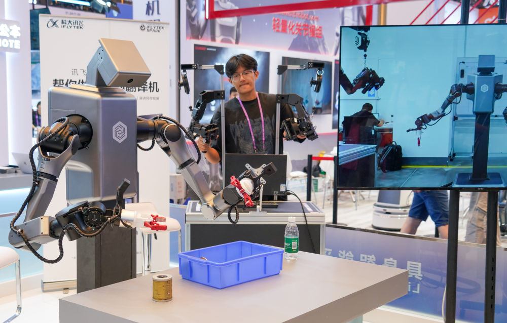 2025年10月16日,工作人员在第138届广交会科大讯飞展台操作机器人拿取物品。