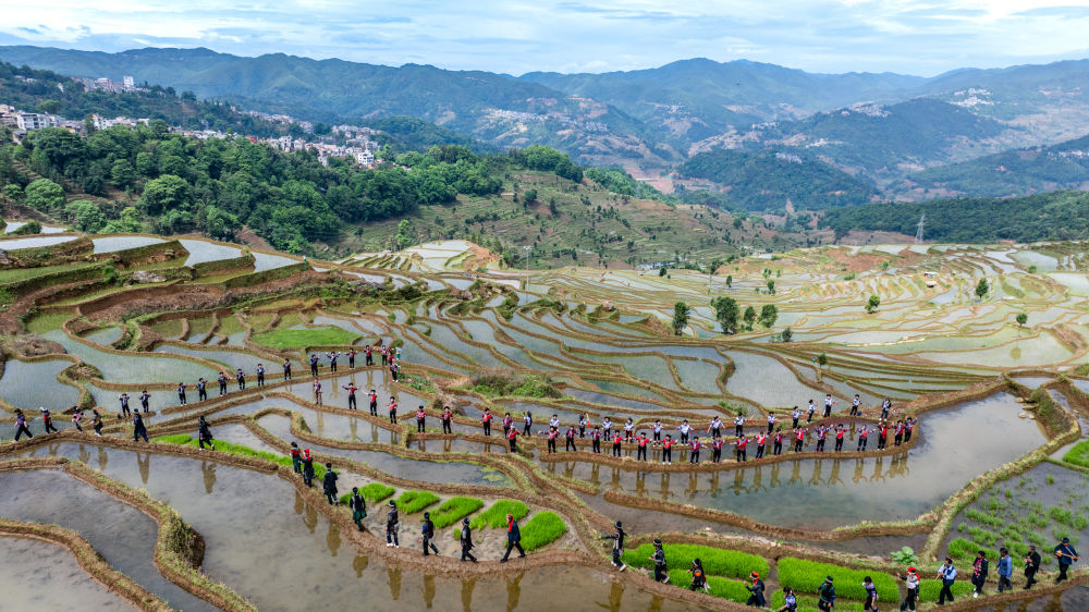 2025年5月2日,在云南省红河县甲寅村“开秧门”仪式上,村民身着民族服饰,沿着田埂踏歌而行(无人机照片)。